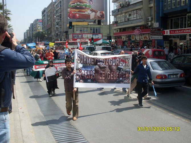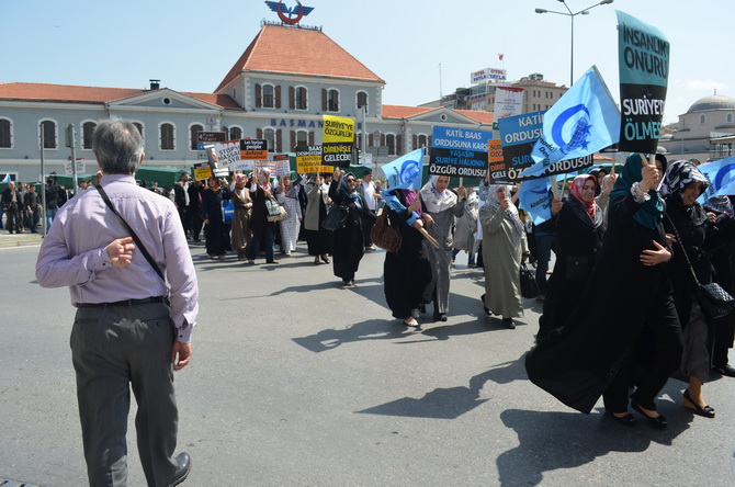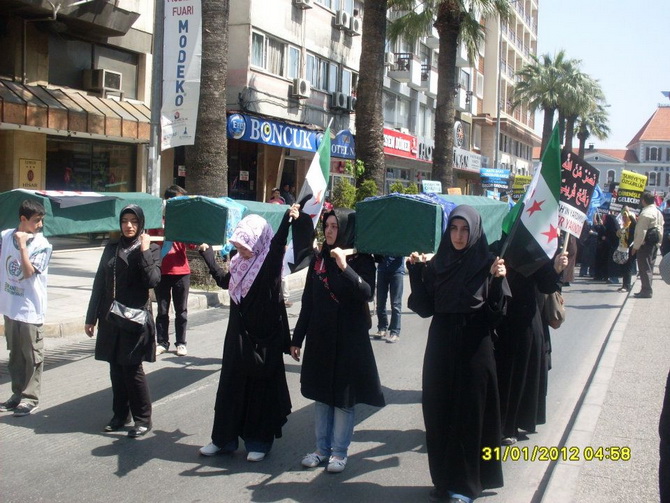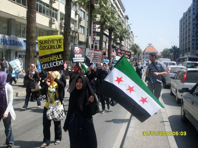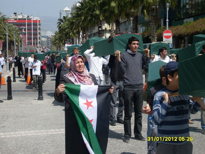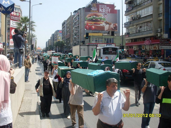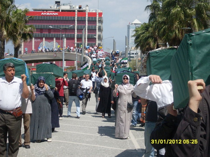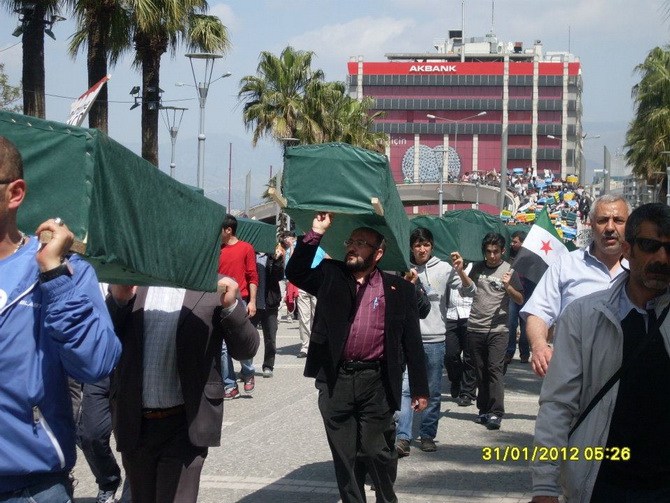 Basmane Garı önünde toplanan yaklaşık bin kişilik grup, omuzladıkları tabutlarla Konak Meydanı'na doğru yürüyüşe geçti. 'Suriye İçin Tabutlarda Ölümü Değil Özgürlüğü Taşıyoruz', 'Suriye'de Vahşet Sürüyor, Sessiz Kalmak Suç Ortaklığıdır', 'Katil Baas Ordusu'na Karşı Yaşasın Suriye Halkının Özgür Ordusu', 'Zulme Rıza Zulümdür', 'Suriye'de Şu An Katliam Devam Ediyor', 'Suriye'ye Özgürlük Direnişle Gelecek' pankartları açarak yürüyen kortej, sık sık tekbir ve teşrik tekbiri getirdi; 'Özgür Suriye Ordusu, Esed'in Korkusu', 'Katil Esed, Suriye'den Defol', 'Katil ABD, Ortadoğu'dan Defol', 'Katil Rusya, Suriye'den Defol', 'Katil İsrail, Ortadoğu'dan Defol', 'Uyan, Diren, Özgürleş', 'Katil Esed, Sonun Mübarek Olsun', 'Suriye'ye Özgürlük Direnişle Gelecek', 'Katliam, Zulüm, Fesad: Kahrolsun Esad', 'Yaşasın Küresel İntifada', 'Yaşasın Suriye Direnişimiz' şeklinde sloganlar attı. Yürüyüş boyunca Fevzipaşa Bulvarı Konak yönüne trafiğe kapandı.