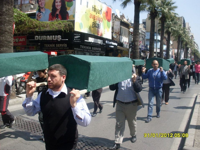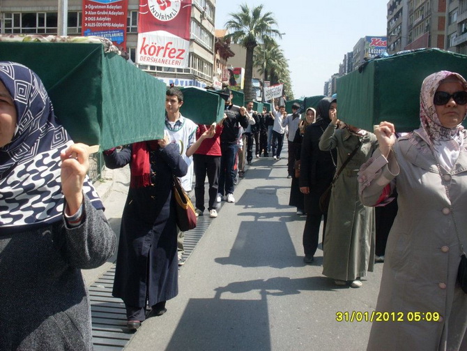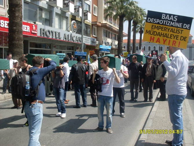 Suriye'nin Baasçı diktatörü Beşşar Esed'in katliamları, İzmir Sivil Toplum Kuruluşları Platformu (İSTOK) tarafından düzenlenen tabutlu yürüyüşle bir kez daha lanetlendi.