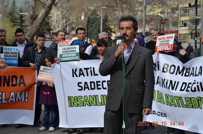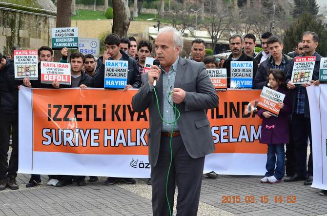 Basın açıklamasını okuyan Özgür-Der Kahramanmaraş Temsilcisi Celal Kurşun, dört yıldır onurlu bir direnişle sürdürülen Suriye Kıyamına karşı olan Esed rejimi ile destekçileri Rusya, Çin, İran, Hizbulesed' in bütün engellemelerine ve yalan haberlerle direnişi karalamaya çalışan yerli işbirlikçilere rağmen ümmetin yiğit evlatlarının büyük bir azimle mücadelelerini sürdürdüklerini vurguladı. Basın açıklamasının ardından Duyarlı Toplum Derneği'nden Av. Haki Demir ve Rıdvan Hoca Vakfı başkanı Osman Kurtoğlu açıklamalarda bulundu. Eylem sırasında sloganlar atıldı. Bunlardan bazıları: "Müslüman Uyuma Kardeşine Sahip Çık", "Zalimler İçin Yaşasın Cehennem", "Şehitlerin Kanı Zalimleri Boğacak", "Halep'e Selam Direnişe Devam", "Lebbeyk Lebbeyk Lebbeyk Ya Allah", "Ya Allah Menna Gayrek Ya Allah", "Katil İran Suriye'den Defol", "Yaşasın Küresel İntifada".