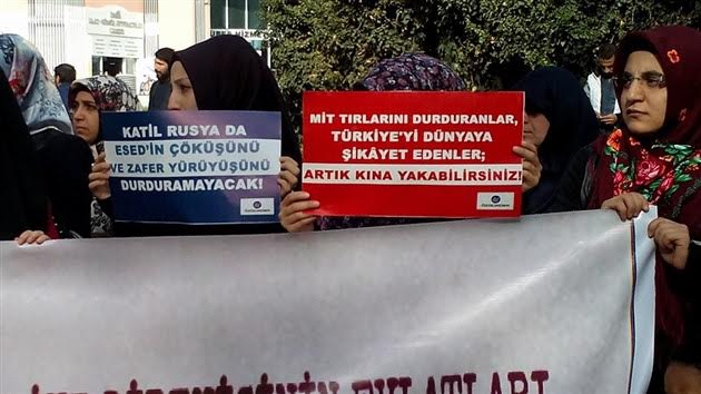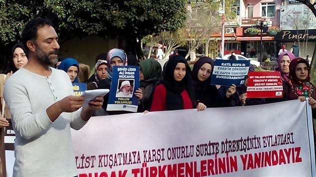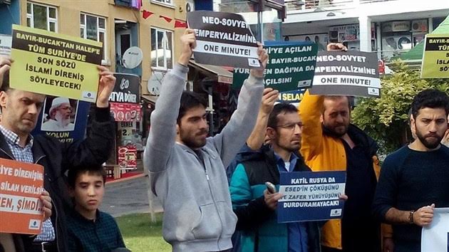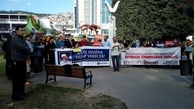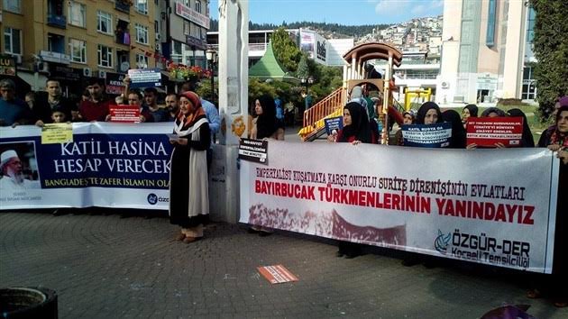 Kocaeli Özgür-Der Yön. Kur. Üyesi Halil İncekara'nın yönettiği eylemde "Emperyalist Kuşatmaya Karşı, Onurlu Suriye Direnişinin Evlatları, Bayırbucak Türkmenlerinin Yanındayız!"; "Katil Hasina Hesap Verecek, Bangladeş'te Zafer İslam'ın Olacak!" yazılı iki pankart açan topluluk ayrıca "Şehit Ali İhsan Mücahid'e, Cemaat-i İslami'ye Bin Selam!"; "Şehit Lider Ali İhsan Mücahid, Yolun Yolumuz..!"; "Katil Rusya da Esed'in Çöküşünü ve Zafer Yürüyüşünü Durduramayacak!"; "Bayır-Bucak'tan Halep'e Tüm Suriye'de Son Sözü İslami Direniş Söyleyecek!"; "Neo-Sovyet Emperyalizmine One Mınute!"; "Kobani'ye Açılan Koridor Türkmen Dağına da Açılsın!"; "Suriye Direnişine Ağır Silah; Hemen, Şimdi..!"; "MİT Tırlarını Durduranlar, Türkiye'yi Dünyaya Şikâyet Edenler; Artık Kına Yakabilirsiniz!" yazılı dövizler taşıdı. Eylem boyunca kitle sık sık "Suriye Halkı Yalnız Değildir!"; "İslami Hareket Engellenemez!"; "Şeyh Hasina Diktası Hesap Verecek!"; "İzmit'ten Halep'e Direnişe Bin Selam!"; "Katil Rusya Suriye'den Defol!"; "Katil İran Suriye'den Defol!" vb. sloganlar attı.