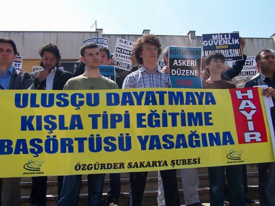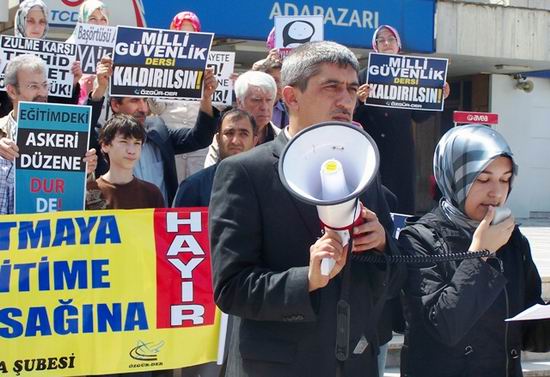"Milli Güvenlik dersleri belki de asli bir fonksiyon olarak okuldaki idareci, öğretmen ve öğrenciler hakkında fişlemelerin yapılmasını sağlıyor" denilerek bu derslerin işlevinin ortaya konulduğu açıklamada, geçtiğimiz günlerde "Adana Seyhan Tepebağ İmam Hatip Lisesi'ndeki onuncu sınıf öğrencilerinin Milli Güvenlik dersi hocası tarafından başlarının zorla açtırılarak Kolorduya götürülmeleri" protesto edilirken, hükümete şu çağrıda bulunuldu: "Biz Özgür-Der Sakarya Şubesi olarak, Milli Güvenlik derslerinin kaldırılarak, okullardaki bu kışla mantığına son verilmesini istiyoruz. İslami kimliğimize yönelik her türlü faşizan ve ayrımcı söz ve tutumları ise şiddetle kınarken, Hükümet ve Milli Eğitim Bakanı'nı görevlerini yapmaya çağırıyoruz. Halka özgürlük vaatleri vermek yerine icraat yapmak her hükümet gibi Tayyip Erdoğan Hükümet'inin de görevidir."