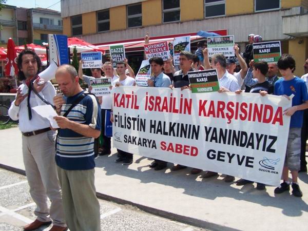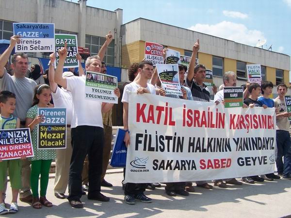 Özgür-Der Sakarya Şubesi adına basın açıklamasını Ali Fuat Us okudu. Açıklamanın ilk bölümünde siyonist askerlerce Mavi Marmara gemisinde işlenen vahşet şu sözlerle lanetlendi: "31 Mayıs sabahı Siyonist İsrail, vahşi ve cani yüzünü bir kez daha gösterdi. Gazze ablukasını kırmak ve oradaki insanlık dışı uygulamaları dünyaya duyurmak maksadıyla insani yardım yüklü Mavi Marmara gemisine baskın yaparak dokuz müslümanı şehid etti ve onlarcasını da yaraladı. Siyonistlerin yaptıkları bu katliam elbette unutulmayacak ve hesabı bir gün mutlaka sorulacaktır. Hamas'ın da ön şart olarak ileri sürdüğü gibi en azından şimdilik 1967 sınırlarına çekilinceye kadar Siyonistler rahat uyku uyuyamayacaklar. Biz Mavi Marmara'da şehid olan kardeşlerimize Allah'tan rahmet dilerken kanlarının uyanış bilinç ve dirilişe vesile olmasını dileriz."