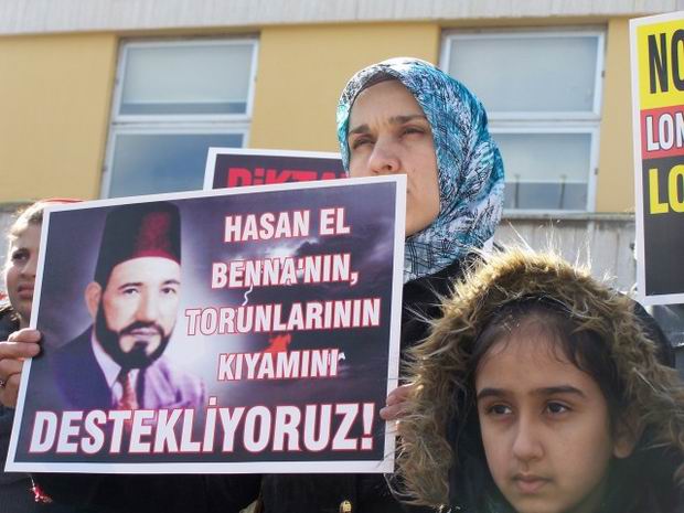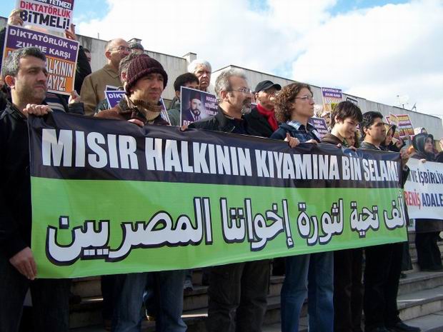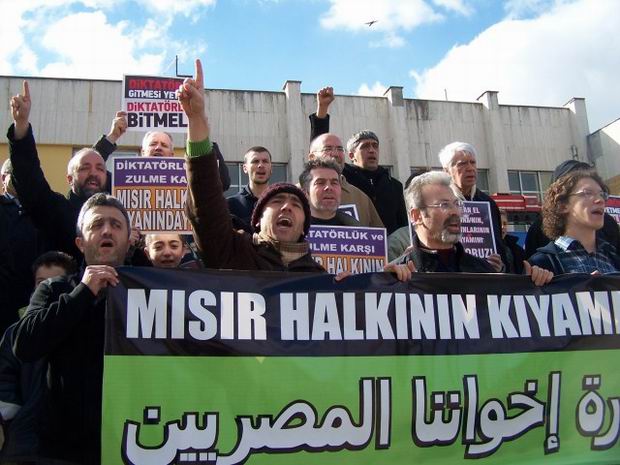 Eylemde "Mısır Halkının Kıyamına Bin Selam!" ve "Zulüm ve İşbirlikçiliğe Karşı; Direniş - Adalet - Özgürlük" pankartlarını açan katılımcılar, "Diktatörün Gitmesi Yetmez; Diktatörlük Bitmeli", "Bütün Ülkelerin Başörtüsü Yasakçıları Bin Ali'nin Akıbetinden İbret Alın", "Zalimler Korksun İntifada Büyüyor", "Hasan el-Benna'nın Torunlarının Kıyamını Destekliyoruz" vb. dövizler taşıdılar. Açıklama boyunca "Tunus'ta Mısır'da İntifada Her Yerde", "Mısır Halkı Yalnız Değildir", "Mısır'a Selam Direnişe Devam", "Emperyalizm Yenilecek İslami Direniş Kazanacak" ve "Tevhid Adalet Özgürlük" sloganları atıldı.