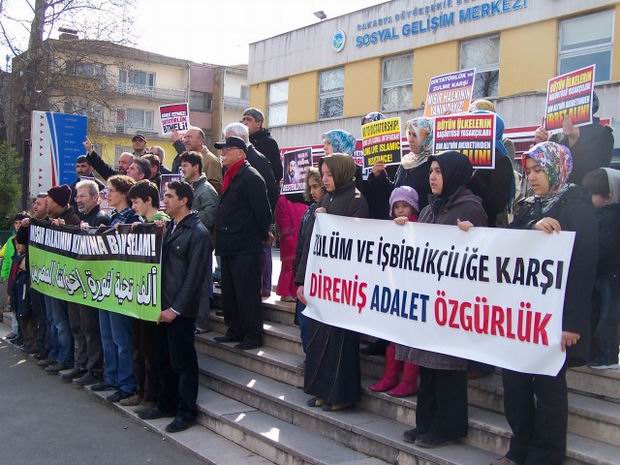 Eylemciler adına basın açıklamasını okuyan Ömer SEVİM, ortaya çıkan bu durumda adalet ve özgürlük taleplerini karşılamada yetersiz ve isteksiz olan, dayatmacı bir sistemin nasıl olur da Ortadoğu halklarına model olarak sunulabildiğinin, küresel aktörlerin amacını çok açık bir şekilde ortaya koyduğunu şu sözlerle dile getirdi: "BOP ve GOP' tan sonra İslam coğrafyasında rol model olarak sunulan ve vitrine konan Türkiye ise bilhassa laik ve demokratik yönü ön plana çıkartılarak, diğer İslam ülkelerinin varmak istedikleri noktaymış gibi gösterilmeye çalışılıyor. Anadilde eğitimi halledememiş, başörtüsü yasağını çözememiş, küresel kapitalizmin yeni üslerinden olmaya aday Türkiye'nin İslam ülkeleri tarafından nasıl ve ne şekilde örnek alınacağı ise tam bir muamma. Henüz sosyal adaleti sağlayamamış, yoksulların emekleri üzerinden seçkinci elitlerin ve bürokratik oligarşinin beslenip semirtildiği, açlıktan bebek ölümlerinin yaşandığı Türkiye'nin medyatik yüzü Tayyip Erdoğan ve Ahmet Davutoğlu marifetiyle İslam coğrafyasına laikliği, demokrasiyi, insan haklarını getireceklerini iddia edenler vahşi kapitalizmin efendileridir."