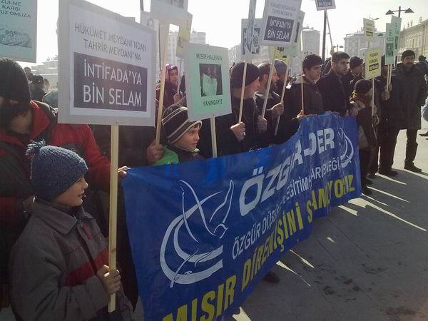 Buradan Hüsnü Mübarek'e sesleniyoruz! Halkın hak ve özgürlük mücadelesinde daha fazla direnme. Artık koltuğu bırakıp iktidarı halka devretmenin zamanı çoktan gelmiştir. Mısır'ı Mısır halkına rağmen yönetemeyeceksin. Bizler Mısır halkının bu onurlu mücadelesinde sonuna kadar yanındayız