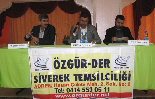 Özgür-Der Siverek Temsilciliği tarafından Siverek Esmerçayır Mahallesinde bulunan Gümüştaş Düğün Salonunda saat 13.30'da "Kürt Meselesi, Halepçeler ve Zulüm" konulu panel düzenlendi. Panele konuşmacı olarak, Mazlumder Genel Başkan Yardımcısı Av. Şeyhmus Ülek ve Özgür-Der Diyarbakır Şube Başkanı Av. Serdar Bülent Yılmaz katıldı.